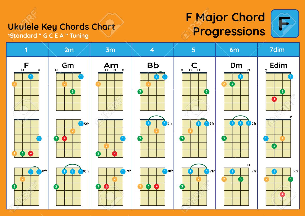 Tabla De Acordes Del Ukelele Afinacion Estandar Ukulele Acordes F Mayor Basico Para Principiantes Tabla De Progresion De Acordes Fotos Retratos Imagenes Y Fotografia De Archivo Libres De Derecho Image 96142127 - The chord will pop up on the ukulele fretboard and diagrams will appear below.
