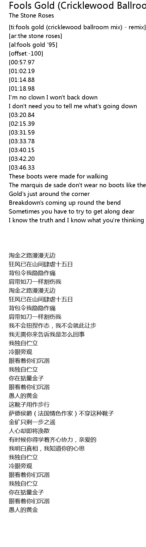 The Stone Roses Fools Gold Official Video Youtube - The gold road's sure a long road winds on through the hills for 15 days the pack on my back is aching the straps seem to the marquis de sade never made no boots like these gold's just around the corner breakdown's coming up round the bend sometimes you have.